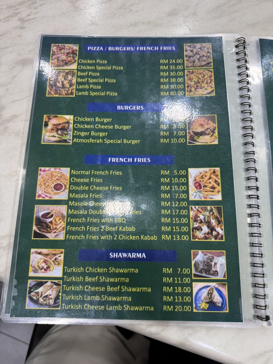 New Atmosferah Restaurant offers a vibrant menu that shines a spotlight on authentic Pakistani and Asian flavors, perfect for breakfast and beyond. Their Nan Ayam Cheese — tender grilled chicken wrapped in soft naan with melted cheese — stands out as a comforting specialty, rich with aromatic spices. For those craving variety, the Nan Corned Beef Cheese and Garlic Cheese Naan bring delightful twists to classic breads. The a la carte options, such as French Fries with BBQ and Chicken Kebab, add a crispy, flavorful complement to your meal.